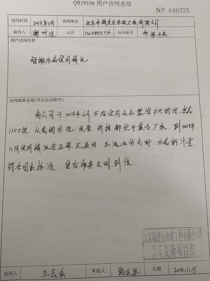 自从2013年采购北京慧怡科技有限责任公司生产的1100块冷水插卡式水表安装投入使用以来,水表运行的稳定性好,无异常、无返修,并且配套系统运作良好、更新快,售后服务到位、热情,解决了我司智慧计量工作的各种难题,提高了计量工作的效率,为我司提供了计量管控便利。